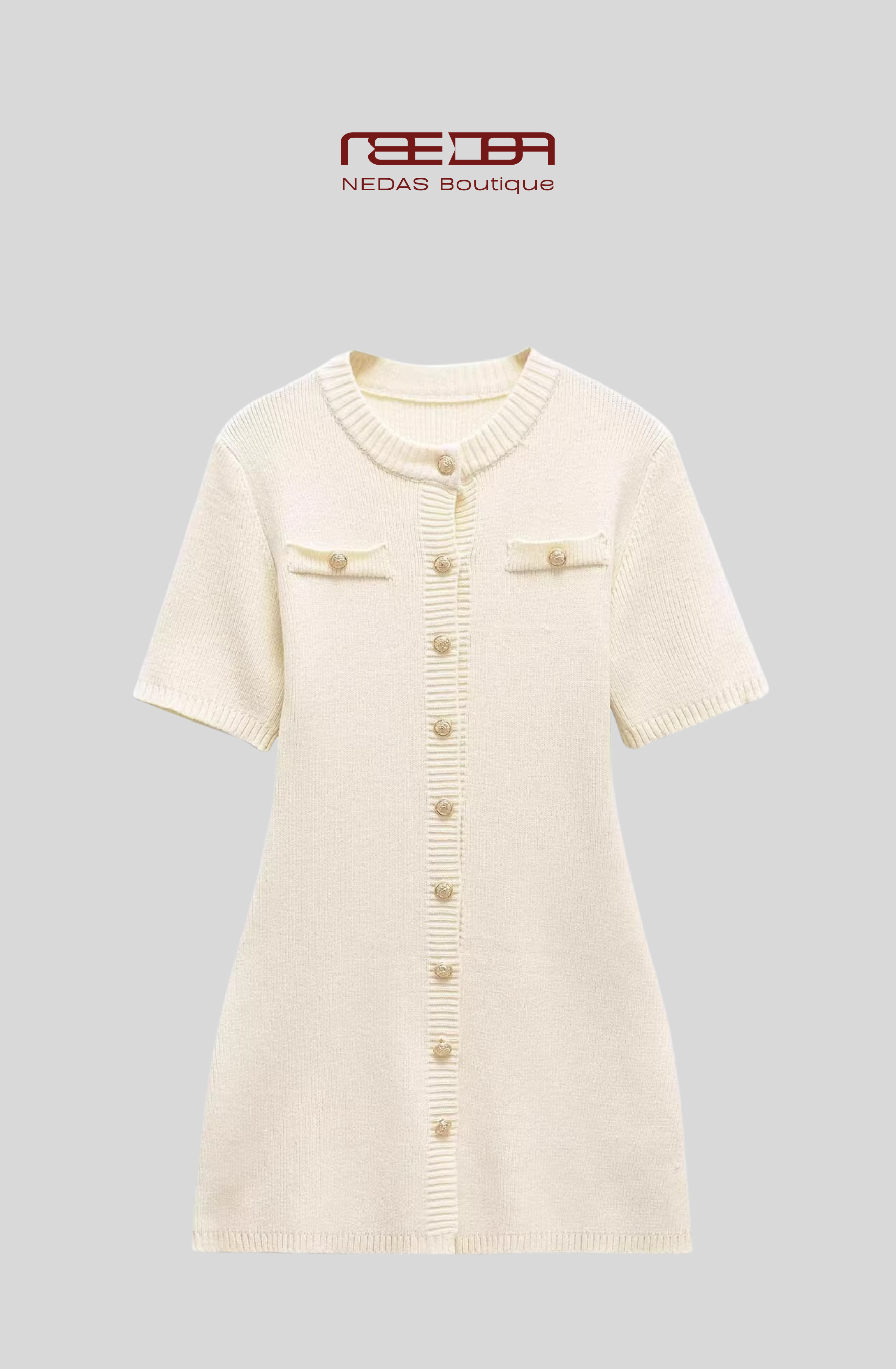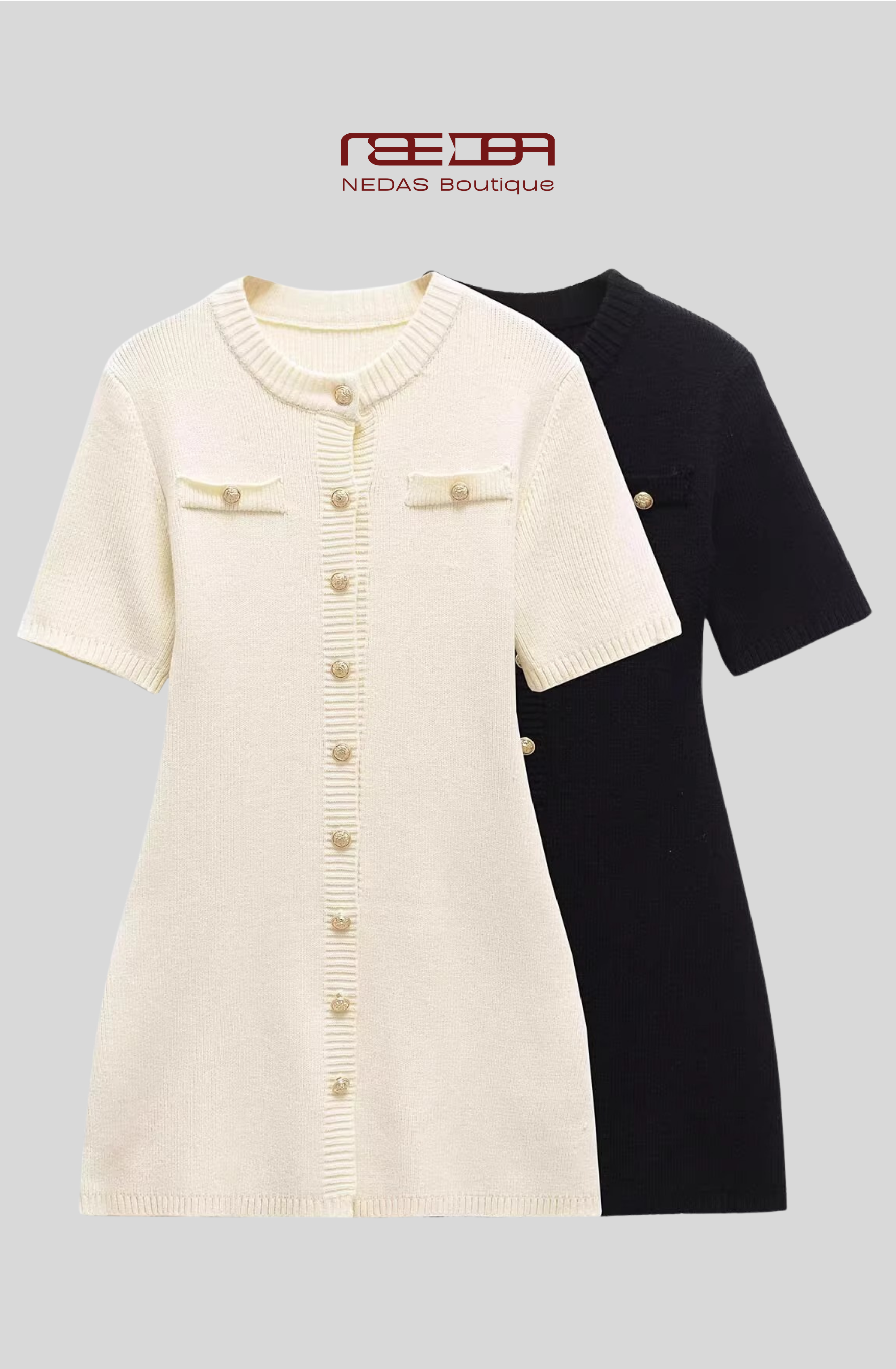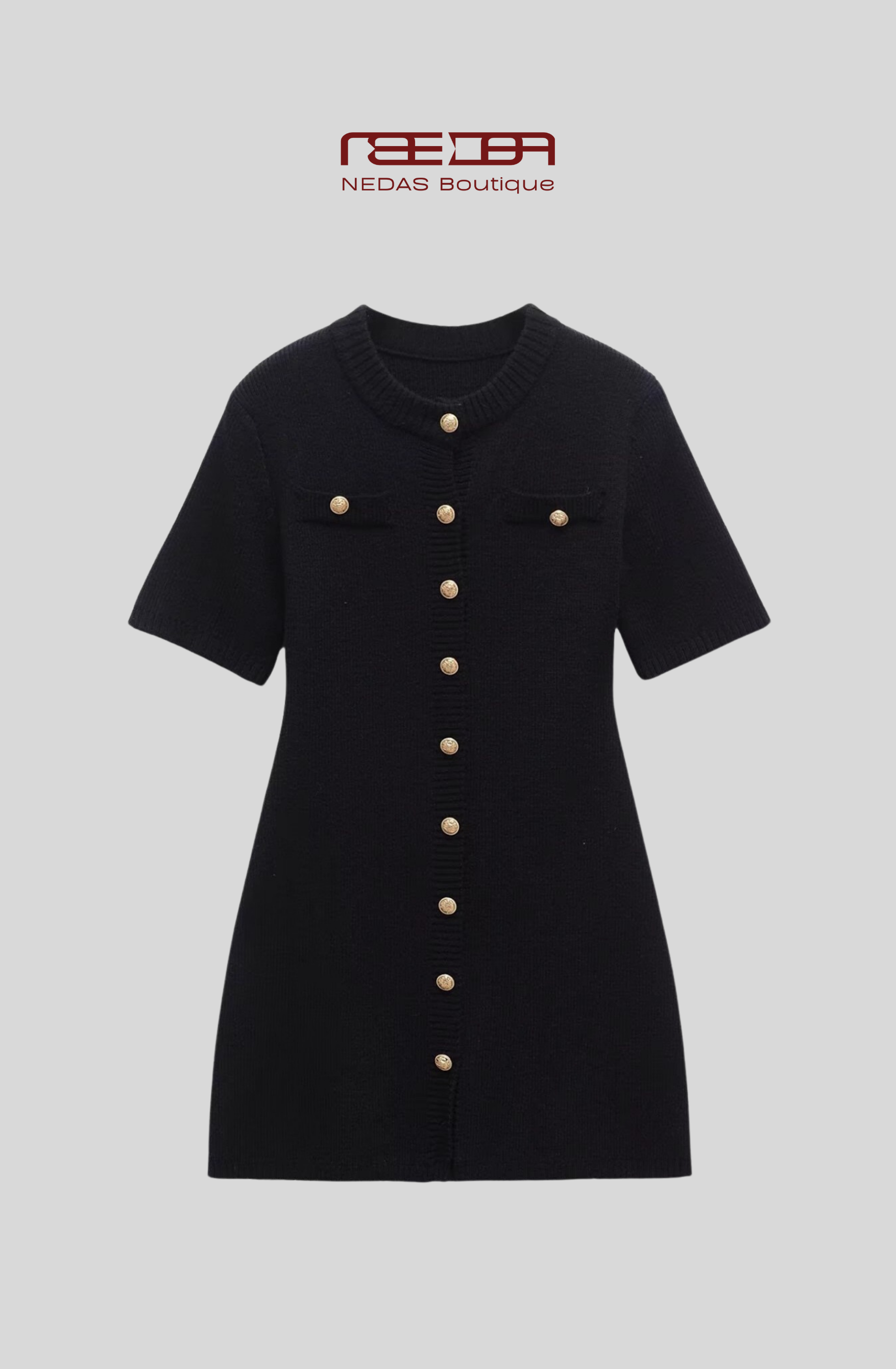 Der weiche Strickstoff sorgt für angenehmen Tragekomfort, während die goldfarbenen Deko-Knöpfe und zierlichen Taschen das Design luxuriös abrunden. Der zeitlose Schnitt mit kurzen Ärmeln macht dieses Kleid zum perfekten Begleiter für Büro, Brunch oder elegante Alltagsmomente.